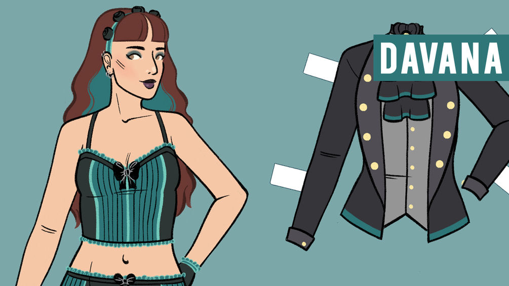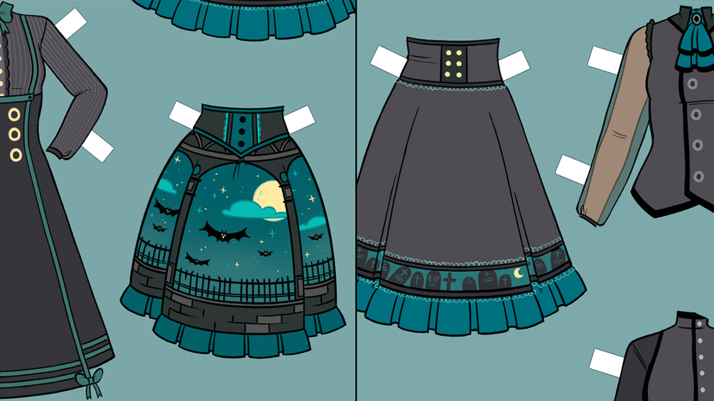 The 2022 redo of my Gothic Lolita doll, Davana! I kept a lot of the old clothing designs, but gave her base a COMPLETE overall. I'm much, much happier with the design I made this time around. Plus, she now has a cool gothic night scene for a skirt! Who wouldn't want something like that in their wardrobe?