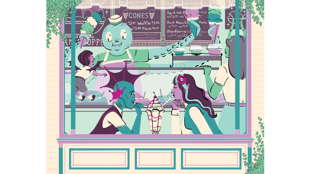 Mint to Be Ice Cream Shoppe: Two teen girls go on a classic first date to the local ice cream shop. This is technically a redo of a much older piece, but I changed so much that it might as well be an original idea. I like this version much more- especially the octopus shop owner!
