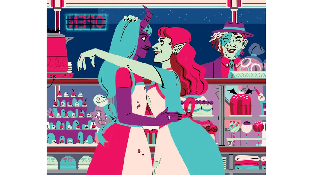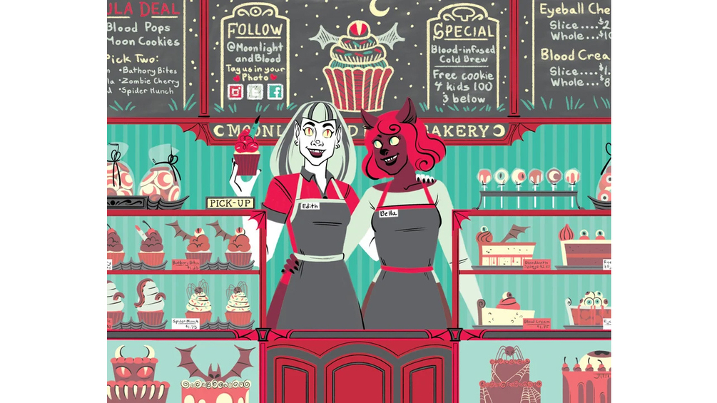 Moonlight & Blood Bakery: Edith and Bella, another pair of wives, proudly pose in their teal-and-red monster bakery. This one is my favorite of the series, but shhhh don't tell anyone!