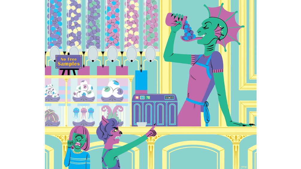 No Free Samples: A candy shop owner demonstrates to two little monsters that only she can get free samples. Listen, after an hour of constant begging, anyone would lose their patience.