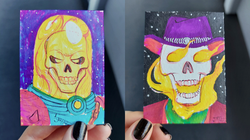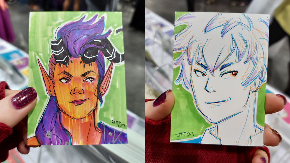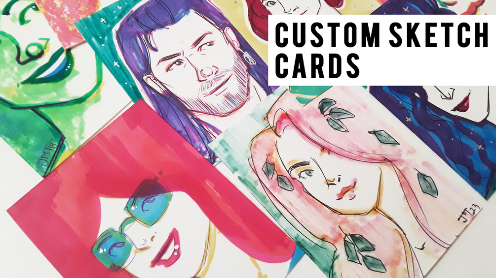 A permanent staple of my booth at art shows and conventions: custom sketch cards! You can request nearly anything- yourself, your partner, your friend,your favorite character, your pet, your oc, WHATEVER- and you will get a colorful custom sketch!
