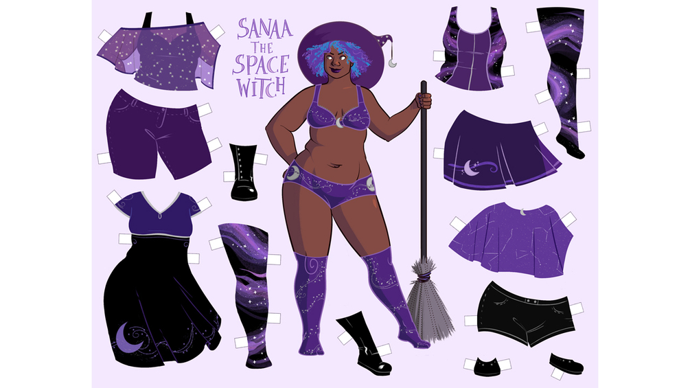 Part of my 2016 Halloween paper doll collection. Sanaa was created out of my life-long love of the night. I'm not going to lie, I still think Sanaa has the best outfit selection out of all my dolls. And people seem to agree- she's one of my most popular dolls.