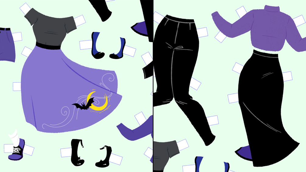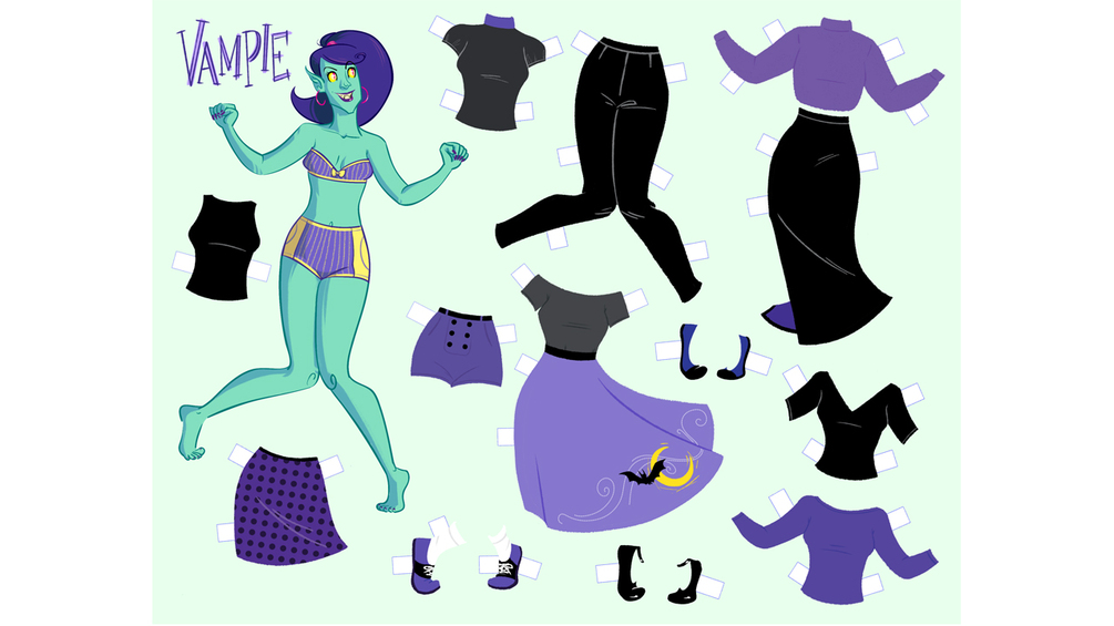 Part of my 2016 Halloween paper doll collection. Vampie is based on 1950s youth culture, with emphasis on college co-eds! The moon & bat dress is still one of my personal favorites.